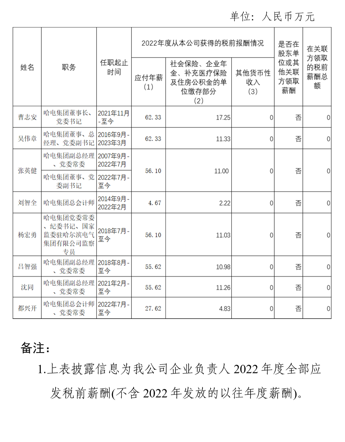 哈爾濱電氣集團(tuán)有限公司企業(yè)負(fù)責(zé)人2022年度薪酬情況