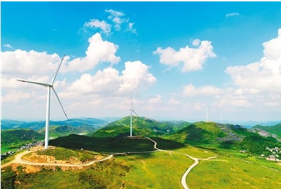 貴州省銅仁市憑借區位優勢和豐富的風能資源,加速風電產業布局與發展。南方電網貴州銅仁供電局全力服務綠色清潔能源的高效并網和充分消納,助推地方實現低碳轉型目標。圖為該市松桃苗族自治縣盤石鎮芭茅村山脊上,風力發電設備隨風轉動發電。向世杰攝(人民視覺)
