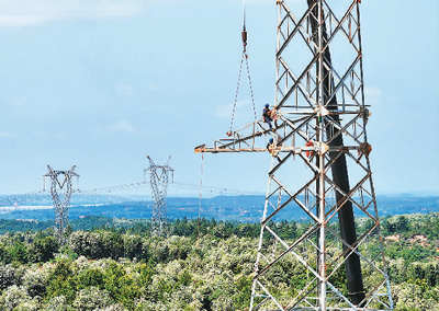 江西500千伏吉安南輸變電工程是江西省重點工程,投運后可加強該省吉安市南部電網與吉安主網聯絡,提升新能源電力消納能力。圖為日前在該項目施工現場,電力工人正在高空進行輸電鐵塔架設安裝作業。
