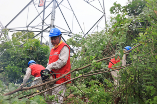 國網(wǎng)重慶電力員工在500千伏洪板一線237號(hào)塔附近修剪樹竹。
