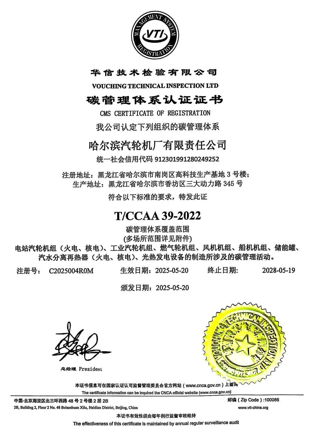 碳管理體系的建立與通過認證,是哈電汽輪機碳管理能力水平提升的重要體現,為公司未來能碳管理工作的高效開展和綠色發展戰略的順利實施提供了有力保障。展望未來,哈電汽輪機將以此次認證為新起點,繼續深耕綠色低碳領域,不斷探索創新,為推動行業綠色轉型和實現國家“雙碳” 目標持續貢獻力量。