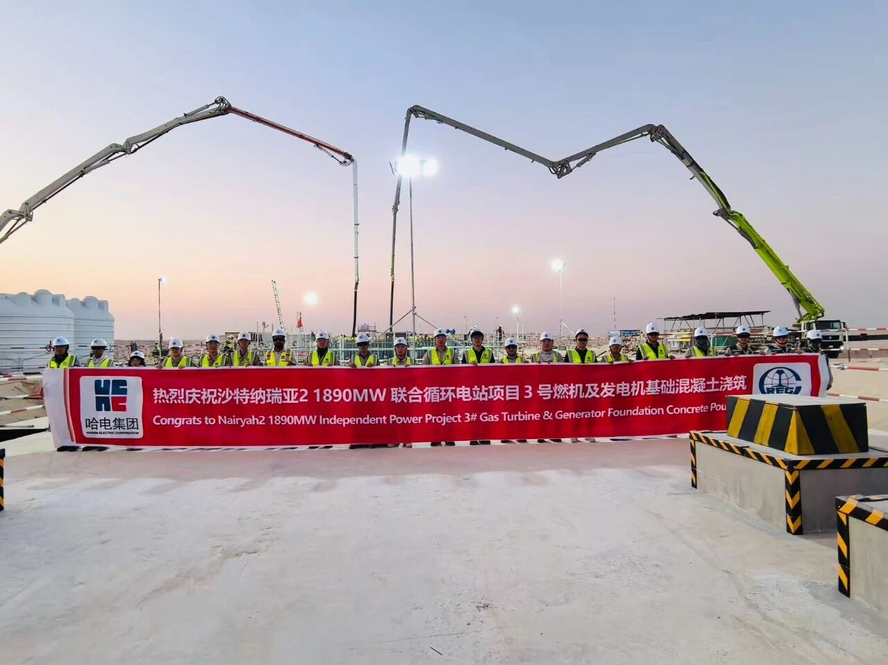 在舉國歡慶中秋佳節之際,哈電國際沙特納瑞亞2項目現場再傳捷報。繼10月2日順利完成2號燃機及發電機基礎混凝土澆筑后,經過數日奮戰,10月7日又成功完成3號燃機及發電機基礎混凝土澆筑工作,以實干獻禮中秋佳節。