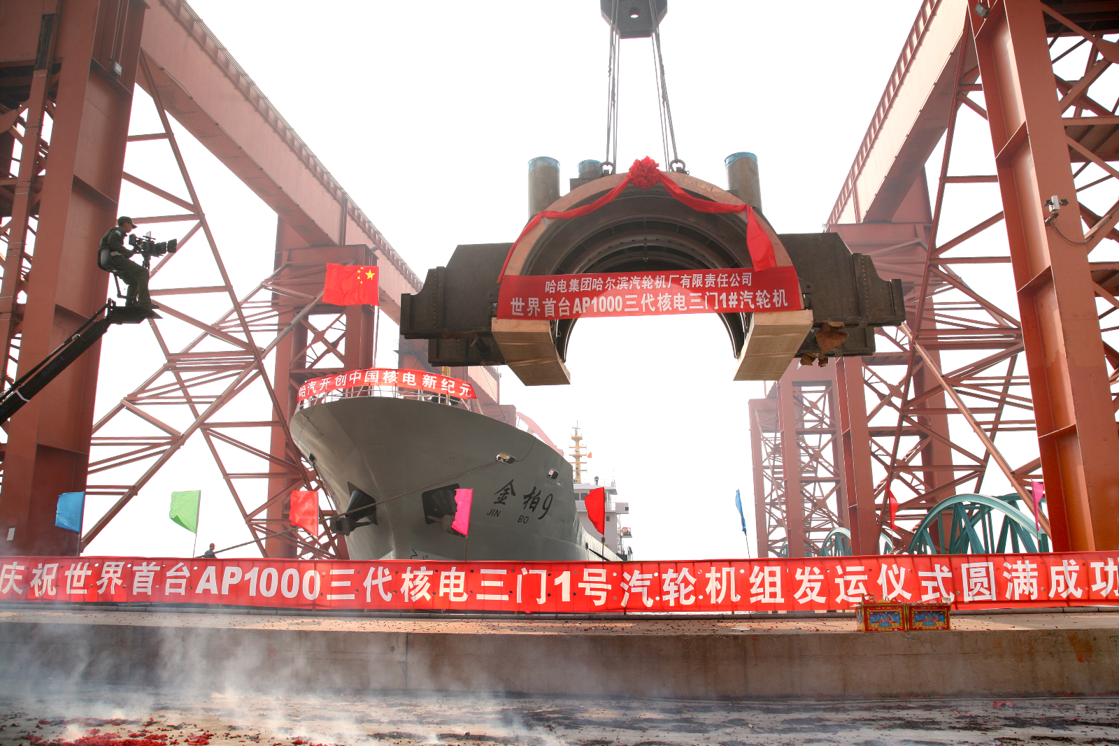 2007年,依托浙江三門核電站一期工程兩臺1250兆瓦等級核電汽輪機合同,哈電集團成為世界上首個進軍三代核電領域的企業。同年,被確定為AP1000蒸發器承制單位和核主泵電機國內唯一承制單位。在創新驅動中國核電自主化進程中,擁攬了“AP1000、華龍一號、CAP1400等系列核電產品的研發制造”成果,擁攬了“三門、海陽AP1000核電汽輪發電機組非核沖轉相繼取得成功”的業績,擁攬了“VVER型百萬核電機組MSR自主化研發國際領先的技術”。2016年,自主設計制造的國家科技重大專項CAP1400主泵屏蔽電機樣機成功交付,標志著哈電集團CAP系列主泵屏蔽電機制造、檢驗和試驗的關鍵技術,100%實現制造國產化,成為國內唯一一家同時具備設計、制造核電軸封主泵和屏蔽主泵電機資質和能力的企業。2017年9月,巴基斯坦恰希瑪核電站C4機組竣工,300兆瓦核電軸封式主泵是哈電集團自主設計制造,是我國第一套出口的自主化核主泵,榮獲“2016年度核能行業科技進步一等獎”等多項殊榮。2018年3月,由哈電集團自主研發制造的世界先進水平,被譽為特高壓電網“定海神針”的全空氣冷卻新型調相機亮相央視《大國重器》英雄譜。