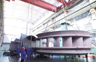 日前,哈電集團(tuán)哈爾濱電機(jī)廠有限責(zé)任公司車間里一派忙碌的生產(chǎn)場景,工人們?nèi)硇牡赝度氲桨Q灘、豐寧、兩河口等國家重大水電項(xiàng)目產(chǎn)品生產(chǎn)中。圖為該公司職工在生產(chǎn)世界單機(jī)容量最大白鶴灘水電機(jī)組1/2瓣座環(huán)組合。